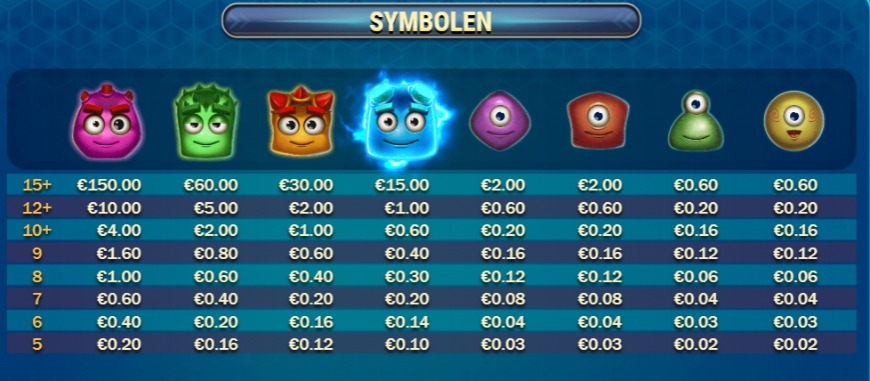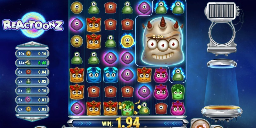 Op Reactoonz heb je verschillende aliens die ieder een eigen waarde hebben. De roze alien met twee ogen is het beste symbool. weet je hier een cluster van 5 te maken, dan heb je in ieder geval je inzet terug. Maak je een cluster van 15 of meer krijg je maar liefst 750x inzet. De gele alien met één oog is het minste waardevolle symbool. Weet je hier een cluster van 5 mee te maken krijg je 0.1x je inzet en wanneer je er een cluster van 15 mee maakt krijg je 3x je inzet.
