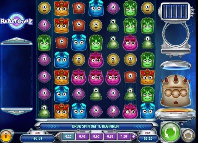 De inzet kun je gemakkelijk onder de rollen van de Reactoonz slot zelf instellen door op de – of + te klikken. De minimale inzet om te spel is € 0,20. De maximale inzet verschilt per online casino. De groene knop moet je indrukken om te spinnen.