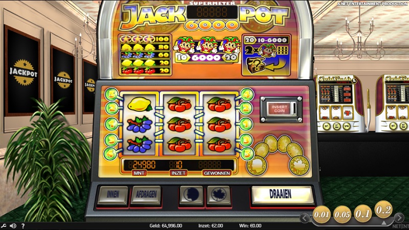 Jackpot 6000 is een fruit slot met een hoog uitkeringspercentage en een gemiddelde volatiliteit. De RTP van Jackpot 6000 is maar liefst 98,86%, wat veel hoger is in vergelijking met andere online slots. Er zijn in totaal 5 winlijnen waarop je met fruitsymbolen en jokers geldprijzen kunt verdienen. De jokers kunnen een prijs tot wel € 6000 opleveren (weet je gelijk waar de naam van deze slot vandaan komt) bij een maximale inzet van 20 credits per beurt. Hiervoor moet je 2x een joker in beeld krijgen op welke plek dan ook. De volatiliteit van Jackpot 6000 ligt net wat lager dan dat van Mega Joker. De reden daarvan is dat deze online slot geen progressieve jackpot heeft en dus gemiddeld gezien vaker prijzen geeft.