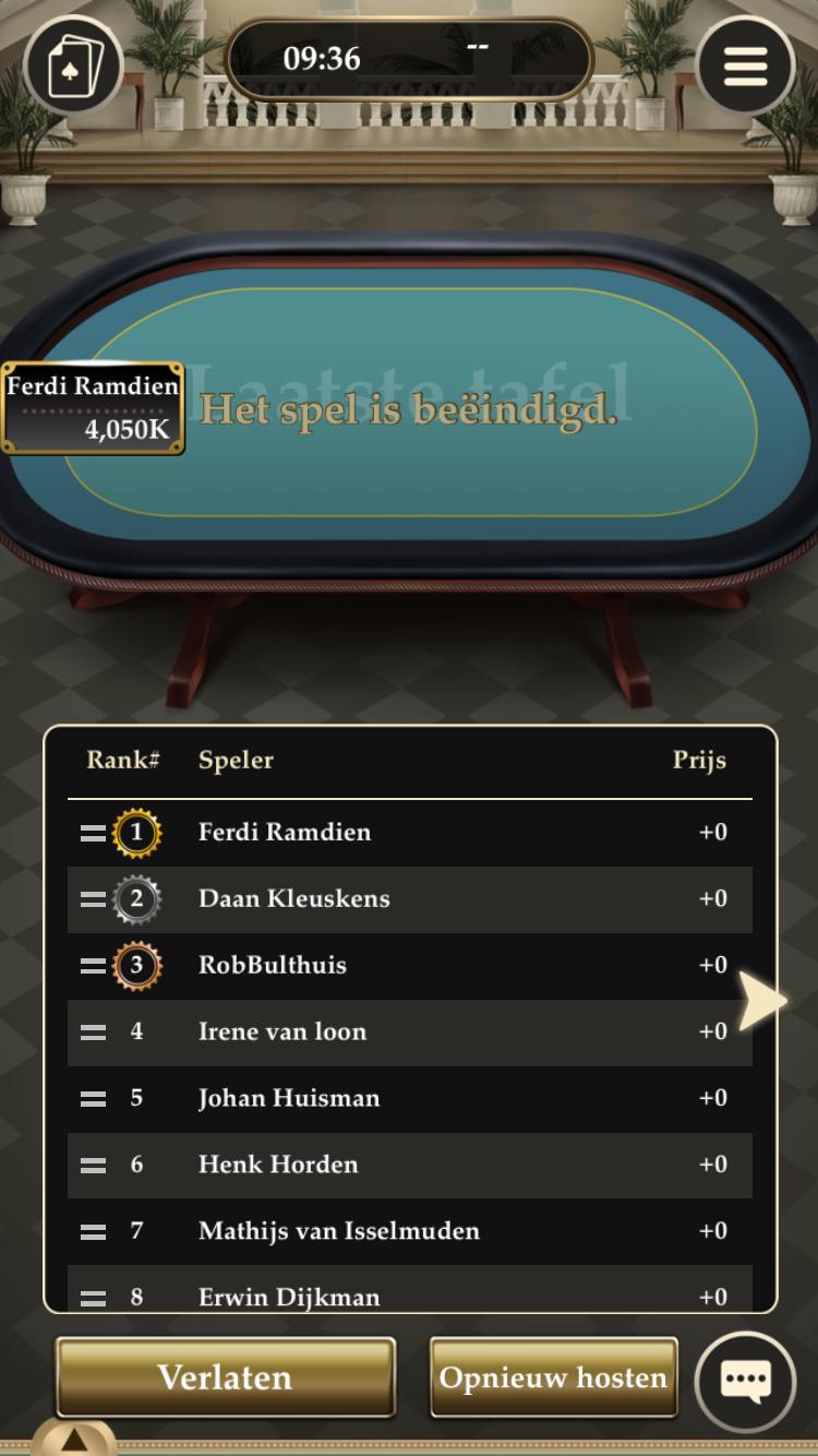 Uitslagen van pokertoernooien in Bistro Zalen 't Zwaantje