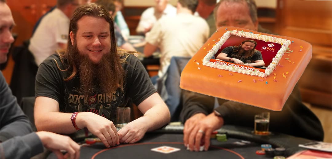 Sebastiaan Haverkate, online beter bekend als 'TheF1chesser', speelde vorige week zijn 1000e geregistreerde ONK Poker toernooi! Dat mag natuurlijk niet zomaar voorbij gaan. Daarom werd hij zaterdag verrast met een heerlijke ONK Poker taart.