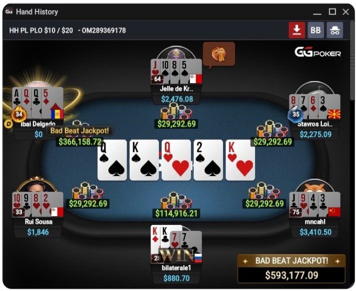 Het overkwam de Moldaviër Ibai Delgado op een online tafel van GGPoker. Hij was een $10/$20 PLO 6-max cash game aan het spelen toen de fortuinlijke hand zicht afspeelde. In totaal zat er $593.177 in de jackpot, welke over de gehele tafel werd verdeeld. Delgado als “ongelukkige” kreeg het grootste deel uitgekeerd. De winnaar van de hand kon rekenen op ruim een ton met $114.916 en de rest van de tafel (waaronder de onder Maltese vlag uitkomende Nederlander Jelle de Kroon) kreeg het restant van elk $29.293 uitgekeerd.