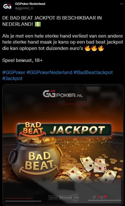 Ook online zijn er mooie Bad Beat Jackpots die regelmatig vallen. Op GGPoker viel de Bad Beat Jackpot begin deze maand maar liefst 5 keer in 24 uur, zo werd er in totaal meer dan $1.000.000,- dollar uitgekeerd aan diverse spelers. Sinds kort is de Bad Beat Jackpot van GGPoker ook beschikbaar in Nederland, en dus wensen we iedereen die daar speelt een mooie bad beat toe! Meer over de Bad Beat Jackpot op GGPoker.nl lees je hier!