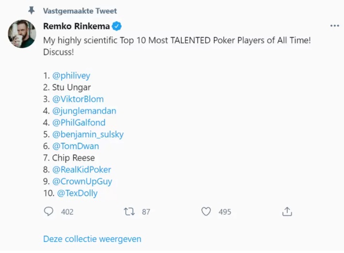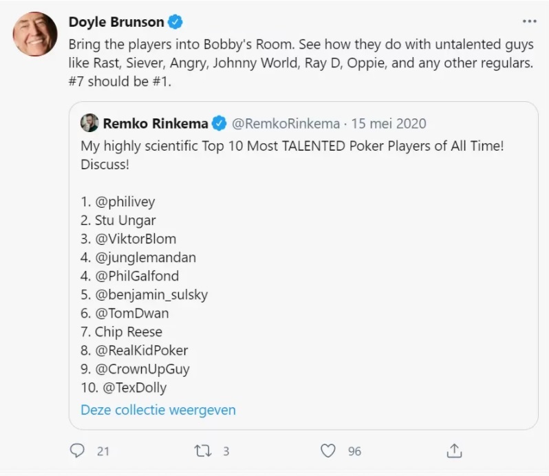 Het gaat over deze tweet die Remko Rinkema vorig jaar op Twitter plaatste. Brunson, de winnaar van onder andere tien World Series of Poker Bracelets, reageerde op het lijstje van Remko.