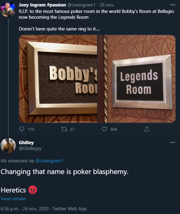 Bobby's room heet sinds een aantal dagen 'Legends Room', terwijl Bellagio heeft gemeld dat de pokerroom op zijn naam zou blijven staan, ondanks dat hij vertrok bij MGM (het moederbedrijf van Bellagio) in 2018. Er word nog steeds actief gespeeld in de 'Legends Room', volgens cardplayer.com werd er vorige week nog een $2.500 - $5.000 mixed game gespeeld. Toch verdwijnt er een stukje poker geschiedenis met de naamsverandering. De pokerwereld reageert erg negatief op de naamsverandering. Pokerlegende Ike Haxton laat weten in een tweet dat hij het onzin vindt, hij gaat het gewoon Bobby's Room blijven noemen. Andere spelers noemen de naamsverandering 'godslastering'.