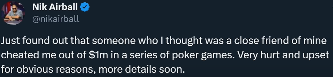 Onder andere Wenzhi "Wesley" Fei en Nikhil Arcot beter bekend als "Nick Airball" zijn recentelijk opgelicht voor miljoenen dollars aan de poker tafel. Zo lieten de high stakes spelers, die de laatste tijd veel te zien zijn bij onder andere livestreams als Hustler Casino Live, weten op twitter.