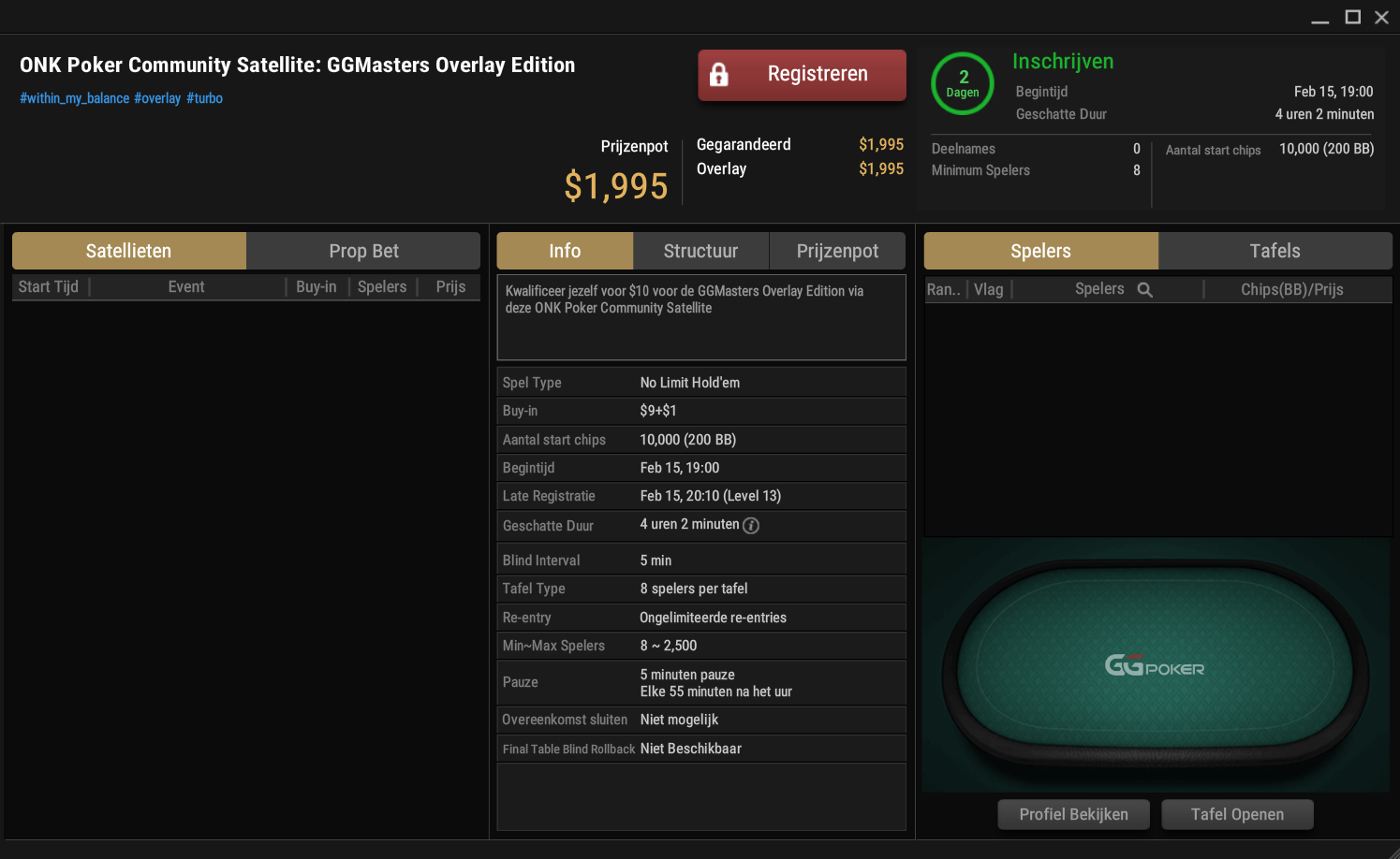 Op donderdag 15 februari om 19.00 uur kun je meedoen om aan de $10 ONK Poker Community Satellite op GGPoker. Om mee te kunnen moet je het wachtwoord: 'ONKMASTERS' invoeren. Er zijn 12x $150 ticket gegarandeerd en daarnaast nog eens 13x een $15 satellite ticket, waarmee jij je alsnog kunt kwalificeren voor de $150 GGMasters Overlay Edition!