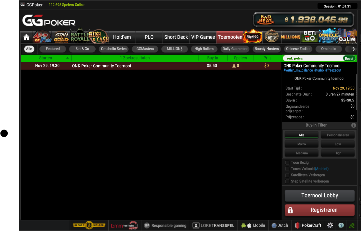 Log in op GGPoker en ga naar de de toernooi pagina. Klik vervolgens op de zoekbalk en zoek naar onkpoker. Het Community toernooi zal in beeld verschijnen. Klik vervolgens op het toernooi en registreer je voor het toernooi. Er zal om een wachtwoord gevraagd worden. Het wachtwoord is: ONKGGPOKER.