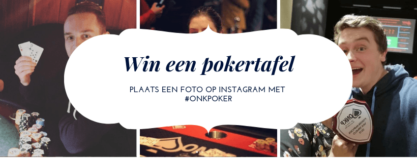 Wegens het vijfjarig jubileum geeft het Open Nederlands Kampioenschap Poker aan het eind van het seizoen een echte ONK Poker pokertafel weg aan één van de ONK Poker deelnemers die een instagram update plaatst met de #onkpoker. Wil jij graag een pokertafel winnen? Plaats tijdens een voorronde een foto op Instagram met de #ONKPoker. Wij zoeken elke maand de 3 leukste foto's uit en deze nomineren wij voor de eindoverwinning.