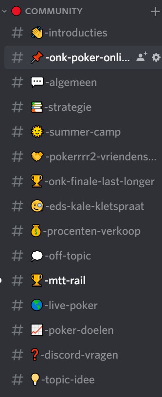 Het ONK Poker channel is opgedeeld in verschillende categoriën, waar je over van alles en nog wat kunt chatten met andere pokerliefhebbers. Ook biedt Discord je de mogelijkheden om vragen te stellen over poker gerelateerde onderwerpen. Voel je vrij om vragen te stellen en vragen te beantwoorden. De sfeer is er goed en pokerliefhebbers helpen elkaar graag om samen beter te worden. De leden uit onze Discord bestaan uit mensen die al jaren lang pokeren én mensen die net zijn begonnen en nog veel willen leren.
