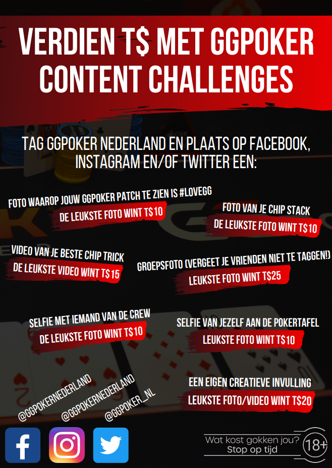 GGPoker wil heel graag weten hoe jij de finale van het ONK Poker beleeft en vraagt je daarom om zoveel mogelijk foto's en video's te maken. Deel deze via je social media accounts en tag GGPoker Nederland om kans te maken op nog meer toernooidollars! Op onderstaande flyer vind je de challenges en de social media accounts van GGPoker.