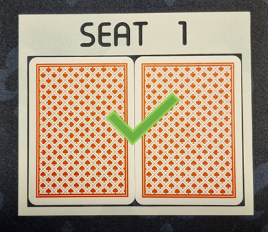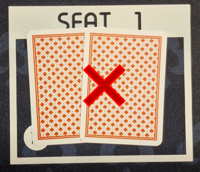 - Wanneer je je twee kaarten gedeeld krijgt, leg je die vóórdat je ze bekijkt even náást elkaar in de box. 1 á 2 seconden is voldoende. Daarna mag je weer doen en laten met de kaarten wat je gewend bent op iedere andere pokertafel. Zorg er dus voor dat je je stack aan de zijkant van de box plaatst. Houd de box zélf, en de ruimte vóór de box vrij.