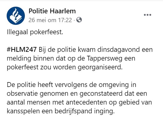 De politie heeft dinsdagnacht na een tip een illegaal pokerfeest ontdekt en opgerold. Het pokerfeest vond plaats in Haarlem en er waren totaal zeventien mensen aanwezig. Drie van hen zijn aangehouden, de rest wordt later verhoord.