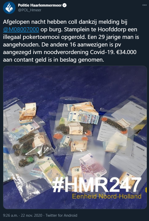 Afgelopen nacht heeft Politie Haarlemmermeer in een woning in Hoofddorp een illegaal pokertoernooi beëindigd. Er is €34.000 contant in beslag genomen en de organisator is aangehouden.
