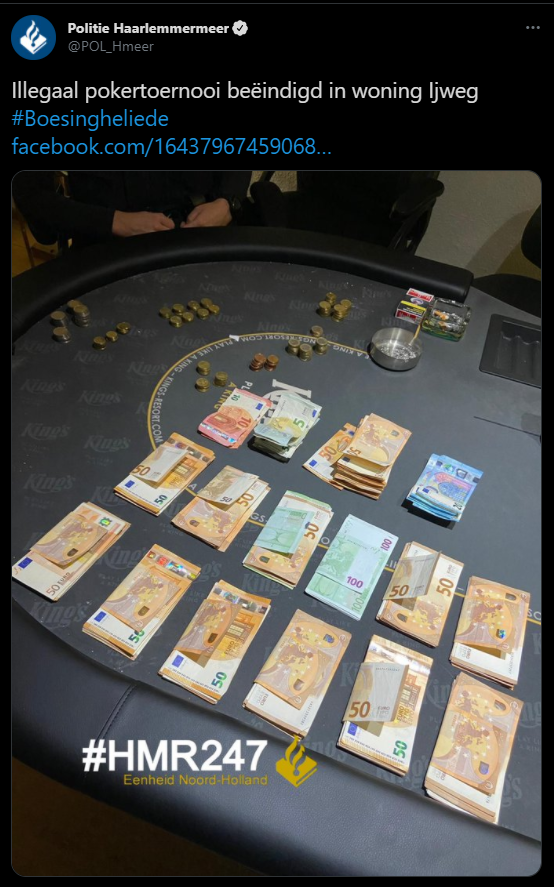 De politie haarlemmermeer sprak in de onderstaande tweet over een illegaal poker toernooi, hoewel de grote hoeveelheid contant geld en de bak in de tafel waarschijnlijk wijst op een illegale cash-game. Op de foto die is gemaakt na de inval is de hoeveelheid contant geld te zien. Opmerkelijk is dat er gespeeld werd op een oude tafel van het Kings Casino. Bij de homegame waren 17 spelers aanwezig, een 38 jarige man is aangehouden.