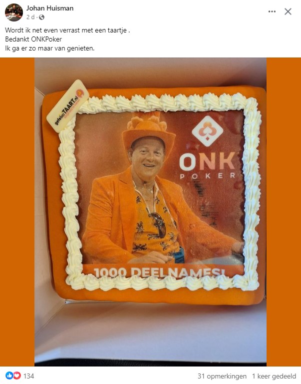 Op de vroege zaterdagochtend werd Johan verrast met een heuse ONK Poker taart! Dit maakte hij op Facebook bekend. Of hij deze helemaal in zijn eentje soldaat heeft gemaakt of anderen ook een stukje heeft gegund is nog niet bekend..