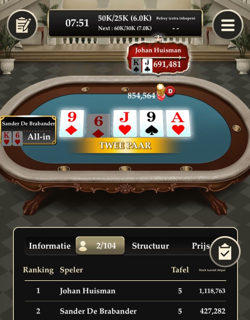 Johan Huisman speelt al sinds 2015 mee met de voorrondes van het ONK Poker. Behalve dat eerste jaar heeft hij zich ieder jaar weten te kwalificeren voor de finale. Gisteren lukte het hem om het Online Pokerkampioenschap van Texel te winnen. In de heads up tegen Sander de Brabander kwam hij uiteindelijk als winnaar uit de strijd. De winnende hand kun je hieronder zien.
