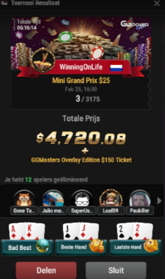 Afgelopen zondag bleef de stream niet alleen lang aan omdat het zo gezellig was, maar ook omdat Johnnie-Jan een diepe run had in de $25 Mini Grand Prix op GGPoker. Hij werd uiteindelijk 3e in een deelnemersveld van 3175 spelers, voor een mooi bedrag van $4,720. Het is niet voor het eerst dat Johnnie-Jan aan een finale tafel mocht deelnemen. In de afgelopen drie weken wist hij in elke zondagavondstream een diepe run neer te zetten en zijn kijkers te belonen.