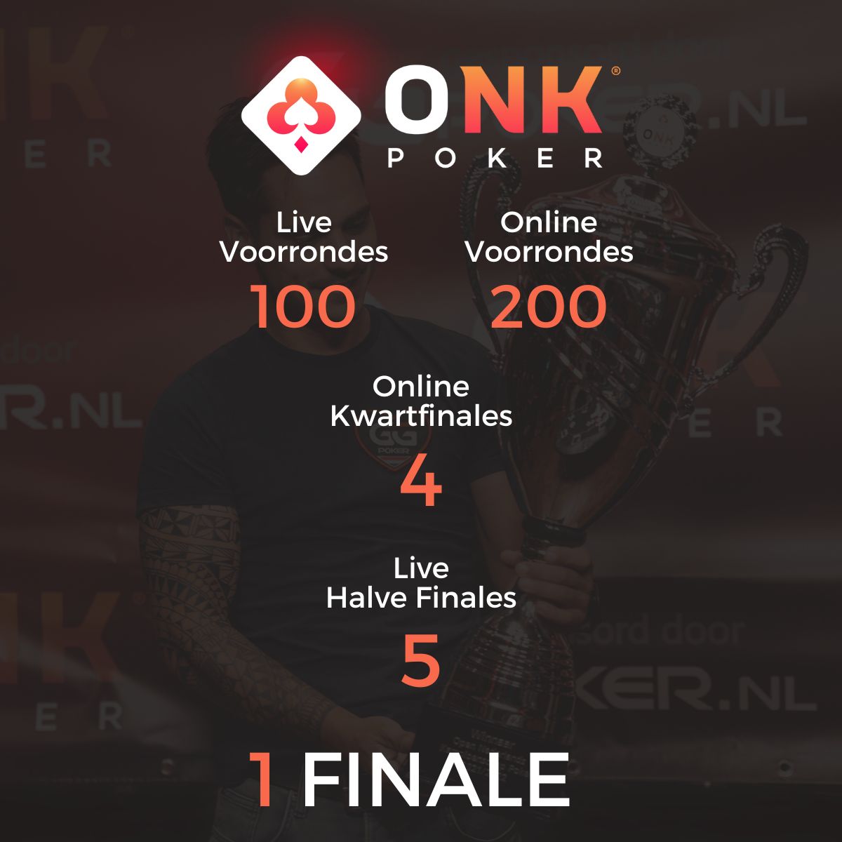 Het vorige ONK Poker seizoen begon omwille van de corona maatregelen met enkel online voorrondes. In totaal hebben we toch nog zeker 50 live voorrondes kunnen organiseren, maar in het nieuwe seizoen willen in ieder geval weer 100 live voorrondes verspreid door heel Nederland organiseren. Daarnaast zullen er ook weer 200 online voorrondes gespeeld worden op de gratis mobiele app Pokerrrr 2. Via zowel de online voorrondes als de live voorrondes kun jij je direct kwalificeren voor de finale van het ONK Poker 22/23!