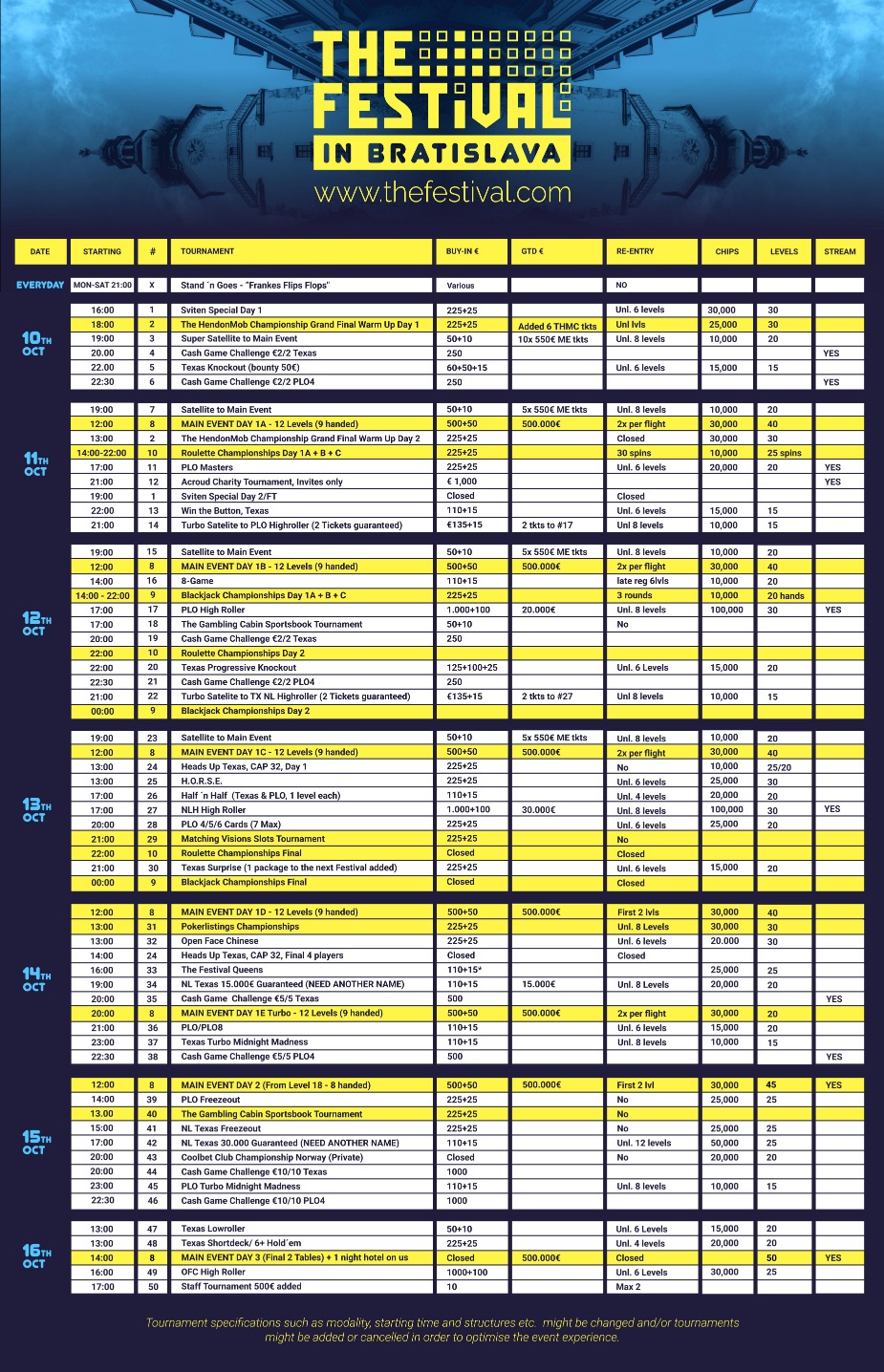 Komende week mogen de Team ONK Poker leden van seizoen 21/22 een laatste mooie pokertrip gaan maken. Helaas is Arjan Elskamp wegens ziekte verhinderd en zullen Johan Huisman en Ruurd Nauta vanmiddag met z'n 2en naar Slowakije vliegen om het Main Event van ‘The Festival’ spelen. Naast het Main Event zijn er ook talloze side events zoals bijvoorbeeld een echt heads-up toernooi. Ben je benieuwd naar het toernooischema?