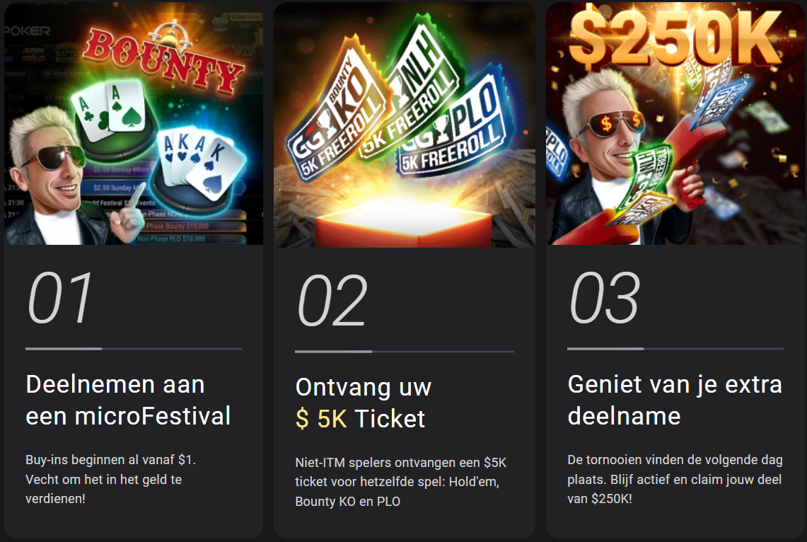 Het Micro Festival op GGPoker is afgelopen weekend van start gegaan, en draait allemaal om toernooien met een lage buy-in en een zo hoog mogelijke gegarandeerde prijzenpot. Als jij je er ondanks de enorme deelnemersvelden in weet te slagen om ver te komen in een toernooi liggen er mooie geldprijzen klaar. Alle 82 toernooien op het programma splitsen zich op in drie varianten; regular, bounty en Omaha.