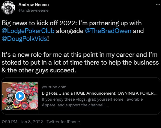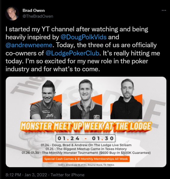 Pokersterren Andrew Neeme, Brad Owen en Doug Polk hebben groot nieuws aangekondigd! Ze slaan de handen ineen en worden de nieuwe eigenaren van The Lodge Poker Club & Card Room, een van de beste pokerlocaties in Texas. In de recente podcast van Doug Polk praat hij met mede eigenaren Andrew Neeme en Brad Owen over onder andere wat hun plannen zijn in The Lodge, Poker vloggers, doelen in Poker en de groei van hun YouTube kanalen.
