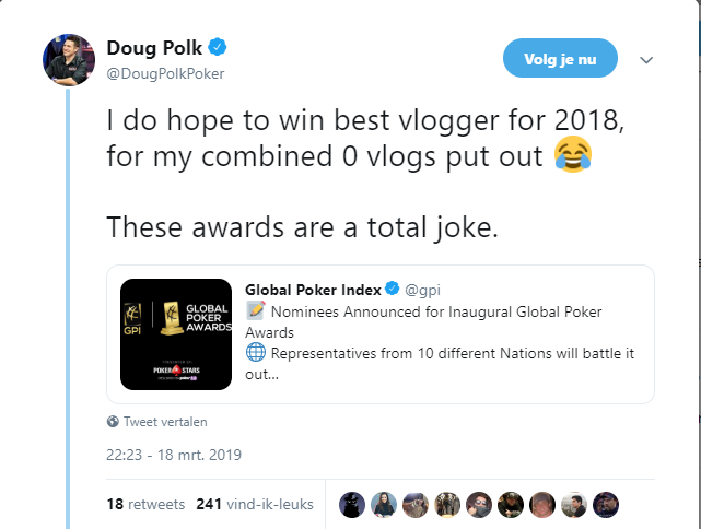 Vrijwel meteen na het bekend maken van de genomineerden gooide Doug Polk een tweet naar buiten en dan weet je dat het wel eens los kan gaan. Doug Polk werd zelf genomineerd voor een award, maar was daar toch wel wat verbaasd over. Hij kreeg een nominatie voor vlogger van het jaar terwijl hij zelf geen enkele vlog heeft gemaakt het afgelopen jaar.