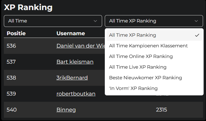 Voorheen was het alleen mogelijk om de XP-ranking van het huidige seizoen te bekijken. Met de onlangs toegevoegde nieuwe rankings vonden we het belangrijk om ook deze terug te laten komen in de gebruikersprofielen. Via de filters onder 'XP Ranking' kun je nu gemakkelijk navigeren naar jouw positie op de verschillende rankings.
