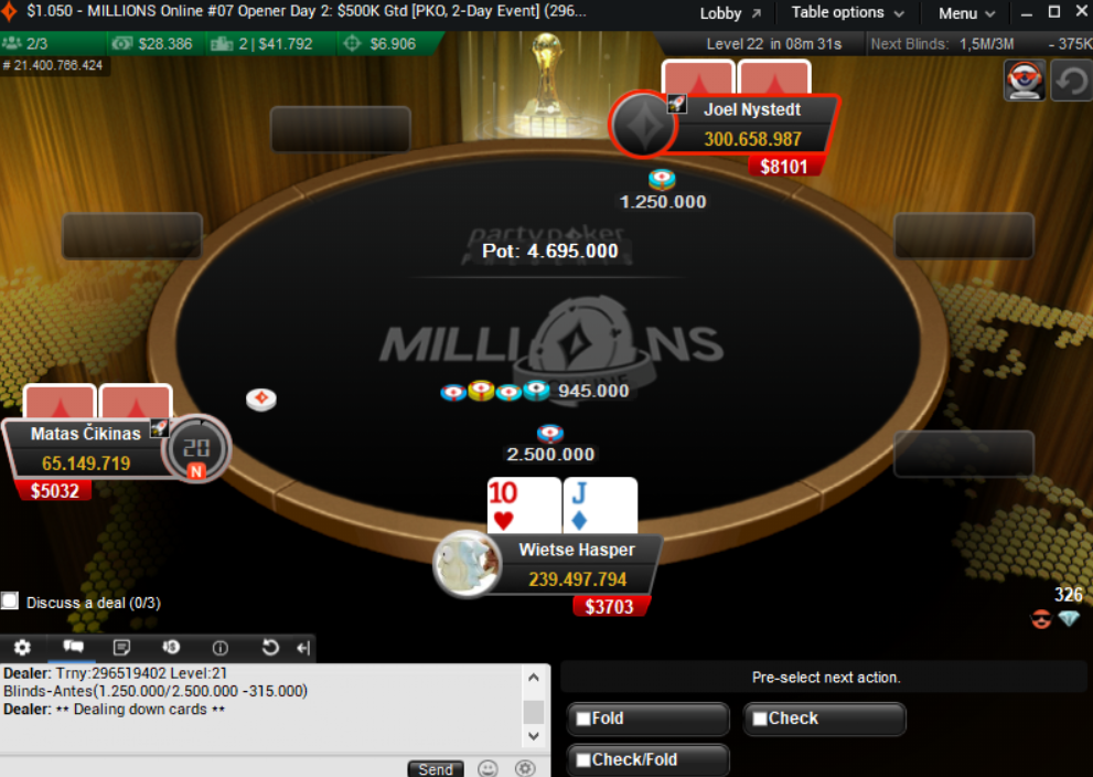De toernooiserie is met een knal van start gegaan. Afgelopen nacht is de $1050 dollar Millions Online Opener gespeeld. Dit 3 daagse evenement kreeg meer dan 600 deelnemers die zorgden voor een prijzenpot van ruim $600.000 dollar. De Nederlandse Wietse H. mocht zilver in ontvangst nemen, hij ontving voor zijn prestatie ruim $48.000 dollar ($41.792 + bounties). De Oostenrijkse Joel Nysted coolerde hem Heads-Up met een flush tegen de straight van Wietse, de winnaar ontving meer dan $90.000 dollar ($41.853 + bounties). Dit is nog maar het begin van de Millions Online voor Wietse, hij heeft zich namelijk ook gekwalificeerd voor een satellite naar de $25.500 dollar Super High Roller. Vanavond zal hij proberen zijn plek te bemachtigen door de strijd aan te gaan met spelers zoals onder andere Dominik Nitsche en Tom Vogelsang.