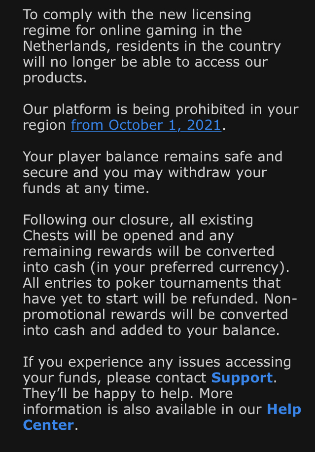Pokerstars liet vandaag via een e-mail weten aan hun Nederlandse gebruikers dat ze vanaf 1 oktober geen poker meer aanbieden in Nederland. Dit betekent dat mensen met een Nederlands account het komende half jaar sowieso niet kunnen spelen op Pokerstars. De verwachting is dat Pokerstars zijn zaken goed op orde krijgt en na een half jaar een licentie zal ontvangen van de KSA. Dit zou betekenen dat de Nederlandse pokeraars in april weer kunnen spelen op de site, net op tijd voor de SCOOP 2022.