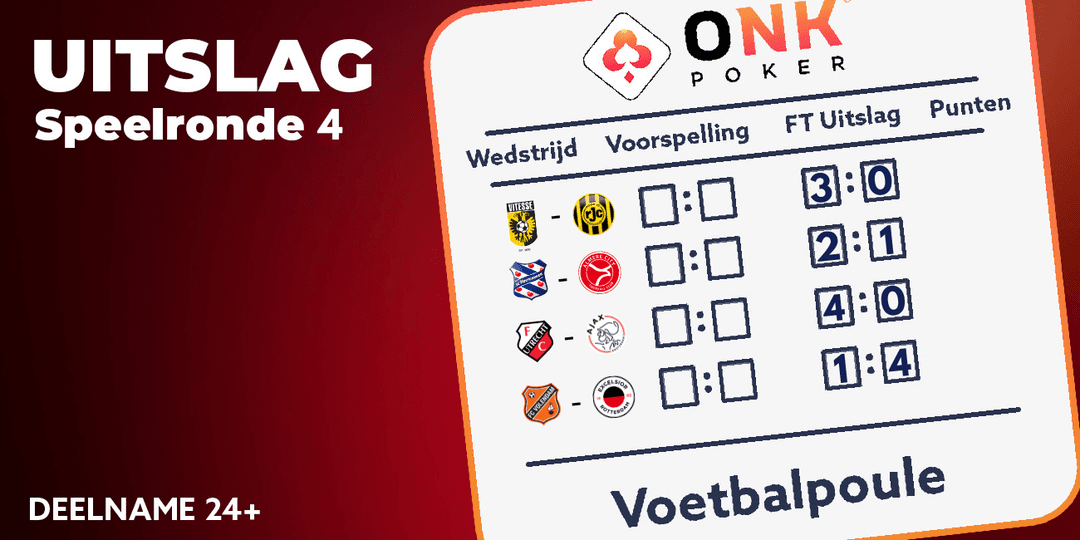 De vierde en laatste speelronde van de ONK Poker voetbalpoule zit erop! In het paasweekend toonden Vitesse en Excelsior aan in goede vorm te zijn in de Keuken Kampioen Divisie door hun wedstrijden winnend af te sluiten. Daarnaast verraste FC Utrecht menigeen met een ruime 4-0 zege tegen titelkandidaat Ajax en wist Heerenveen belangrijke punten te pakken in de strijd om de play-offs door te winnen van Almere City