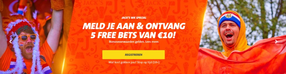Jack's Casino heeft een speciale Jack's WK Special welkomstbonus. Wanneer je je nu aanmeld bij Jack's en minimaal €20 stort, dan ontvang je 5 free WK bets ter waarde van €10. In totaal krijg je dus €50 aan gratis bets. Aan deze bonus zitten een paar belangrijke voorwaarden. De free bets moeten op een WK wedstrijd worden ingezet en per free bet dien je de gehele €10 in te zetten. Win je een gespeelde bet, dan wordt de winst uitbetaald op je normale speelsaldo. De welkomstbonus valt het gehele WK te claimen voor nieuwe spelers van 24 jaar of ouder.