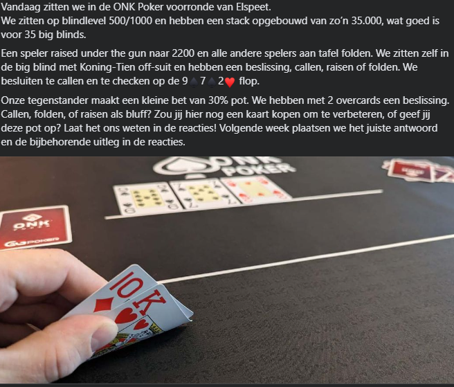 flop. Onze tegenstander maakte een kleine bet en we hadden een beslissing met 2 overcards, callen, raisen of folden. Wat besloot jij hier te doen?