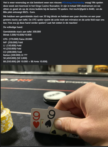 Afgelopen woensdag kwamen we met weer een nieuwe #StrategyWednesday. De wekelijkse strategie vraag waar we een (lastige) poker situatie willen simuleren, om te kijken wat jij hier zou doen. Bij de afgelopen #StrategyWednesday speelden we een €440,- euro toernooi in het Kings Casino Rozvadov. We belandden op de bubble met een gemiddelde stack van 30bb en zagen een open uit vroege positie. Wat zou jij hier doen met