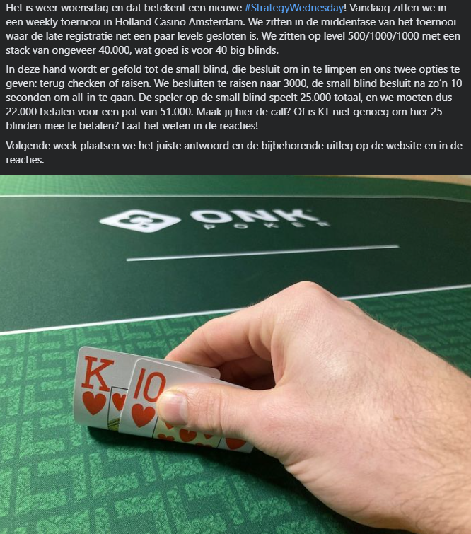 Vorige week speelden we een weekly toernooi in Holland Casino Amsterdam en moesten we een grote pre-flop beslissing maken met een marginale hand. We besloten te raisen op de big blind na een small blind limp, die vervolgens all-in ging voor 25 blinden. Wat besloot jij om hier na te doen? Maakte jij de call, of fold jij hier liever om niet zo veel chips te riskeren?