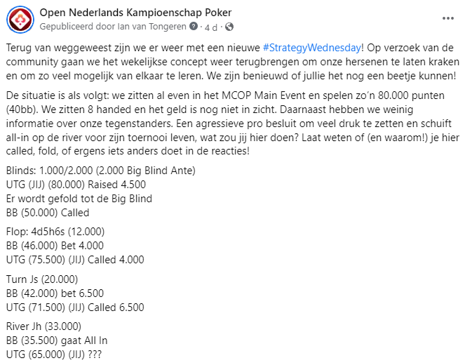 Afgelopen woensdag keerde na lange tijd Strategy Wednesday terug op op onze Facebook pagina. Elke woensdag plaatsen wij een bepaalde situatie waarin je terecht kan komen, waarop gereageerd kan worden. Een aantal dagen later geven wij een uitgebreide analyse van hoe je deze hand zou moeten spelen. Door de vele enthousiaste reacties hebben we besloten om dit weer wekelijks terug te laten komen.