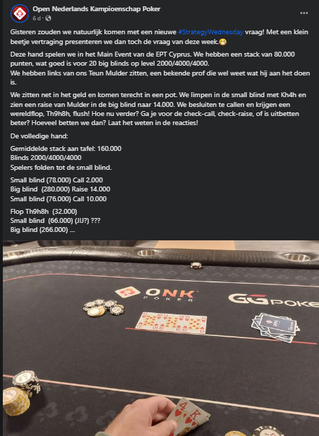 Afgelopen donderdag kwamen we met weer een nieuwe #StrategyWednesday (met een klein beetje vertraging). De wekelijkse strategievraag waar we een (lastige) poker situatie willen simuleren, om te kijken wat jij hier zou doen. Bij de afgelopen #StrategyWednesday zaten we in het EPT Cyprus main event en flopten we een flush small tegen big blind. We hebben weer een hoop verschillende reacties gekregen uit de community. Had jij het goed?