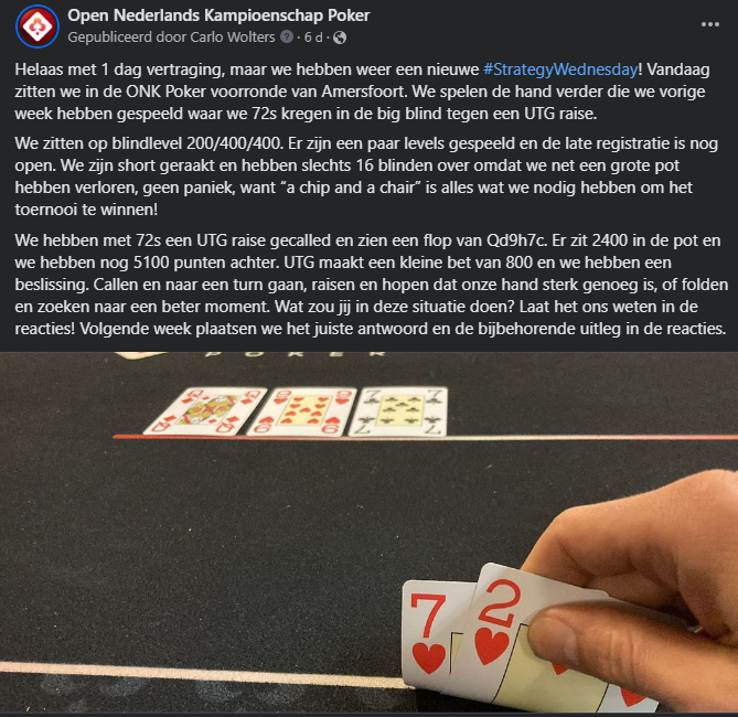 Afgelopen woensdag kwamen we met weer een nieuwe #StrategyWednesday. De wekelijkse strategie vraag waar we een (lastige) poker situatie willen simuleren, om te kijken wat jij hier zou doen. Bij de afgelopen #StrategyWednesday kregen we