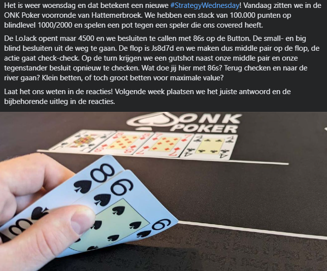 Vorige week speelden we bij de voorronde van Hattemerbroek een hand waar we een paartje flopten en op de turn belandden. Hier hadden we de optie om opnieuw terug te checken of om toch maar voor value te gaan. Wat besloot jij hier te doen?