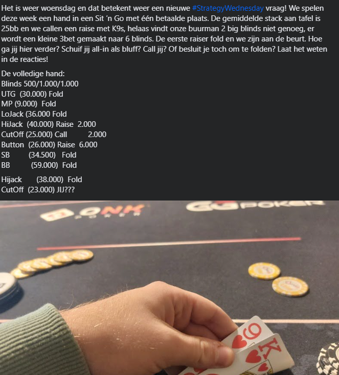 Afgelopen woensdag kwamen we met weer een nieuwe #StrategyWednesday. De wekelijkse strategie vraag waar we een (lastige) poker situatie willen simuleren, om te kijken wat jij hier zou doen. Bij de afgelopen #StrategyWednesday speelden we een Sit ‘n Go en betaalden we een Hijack raise met