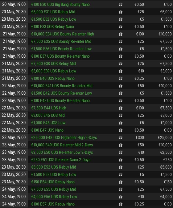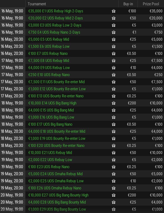 Unibet heeft aangekondigd met een tweede edite van de Unibet Online Series (UOS) van dit jaar te komen. De UOS keert in mei terug voor de tweede keer in 2021. De toernooiserie start op 16 mei en eindigt op de laatste dag van de maand. De eerste editie van de UOS vond plaats van 26 februari tot en met 21 maart dit jaar.