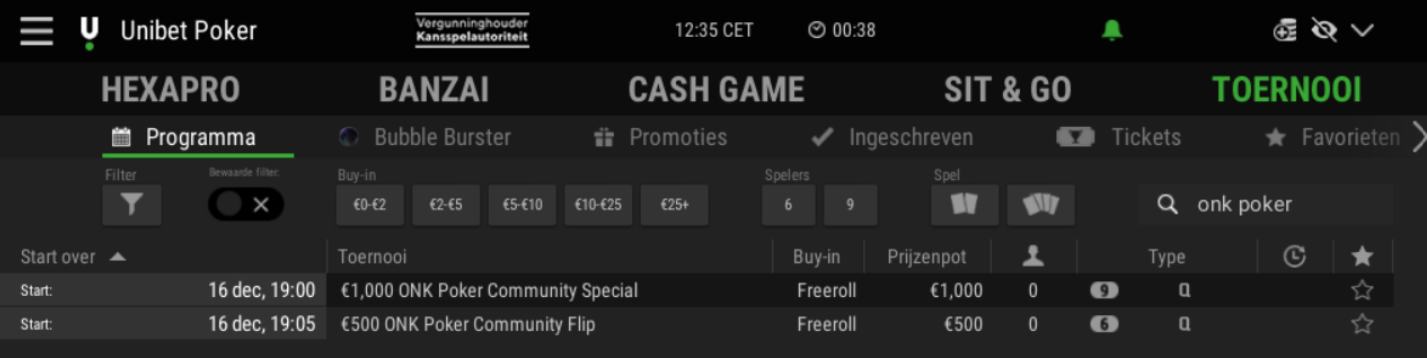 De Unibet Freeroll zal zoals gezegd plaatsvinden op 16 december om 19:00. Met de freeroll valt er voor €1.000,- aan toernooitickets te winnen voor de deelnemers. Met de toernooitickets kan je aan één van de vele toernooien op Unibet. Om mee te doen aan de Community freeroll zoek je in de toernooi lobby van Unibet op ONK POKER COMMUNITY SPECIAL. Wanneer je bij het toernooi uitkomt kun je je inschrijven en moet je een wachtwoord invullen. Het wachtwoord voor de freeroll is: ONK2022 Het toernooi staat inmiddels al in de lobby. De inschrijving opent vrijdagochtend om 07:00.