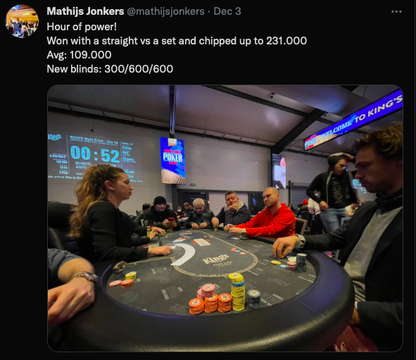 Op dit moment wordt er nog volop poker gespeeld tijdens dag 1B. Morgen sluit Mathijs Jonkers samen met de andere overgebleven Nederlanders weer aan voor dag 2. Wij wensen hun alvast veel succes.