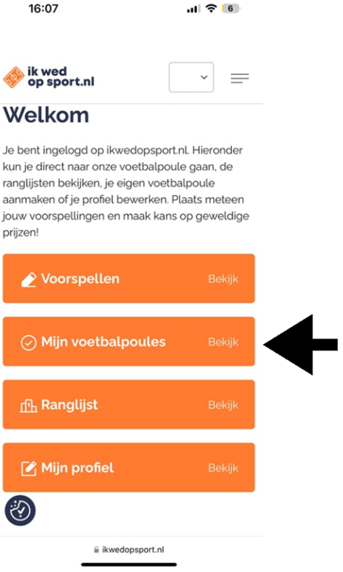 Stap 3: Na het voltooien van je registratie ga je naar 'Mijn voetbalpoules' via het menu.