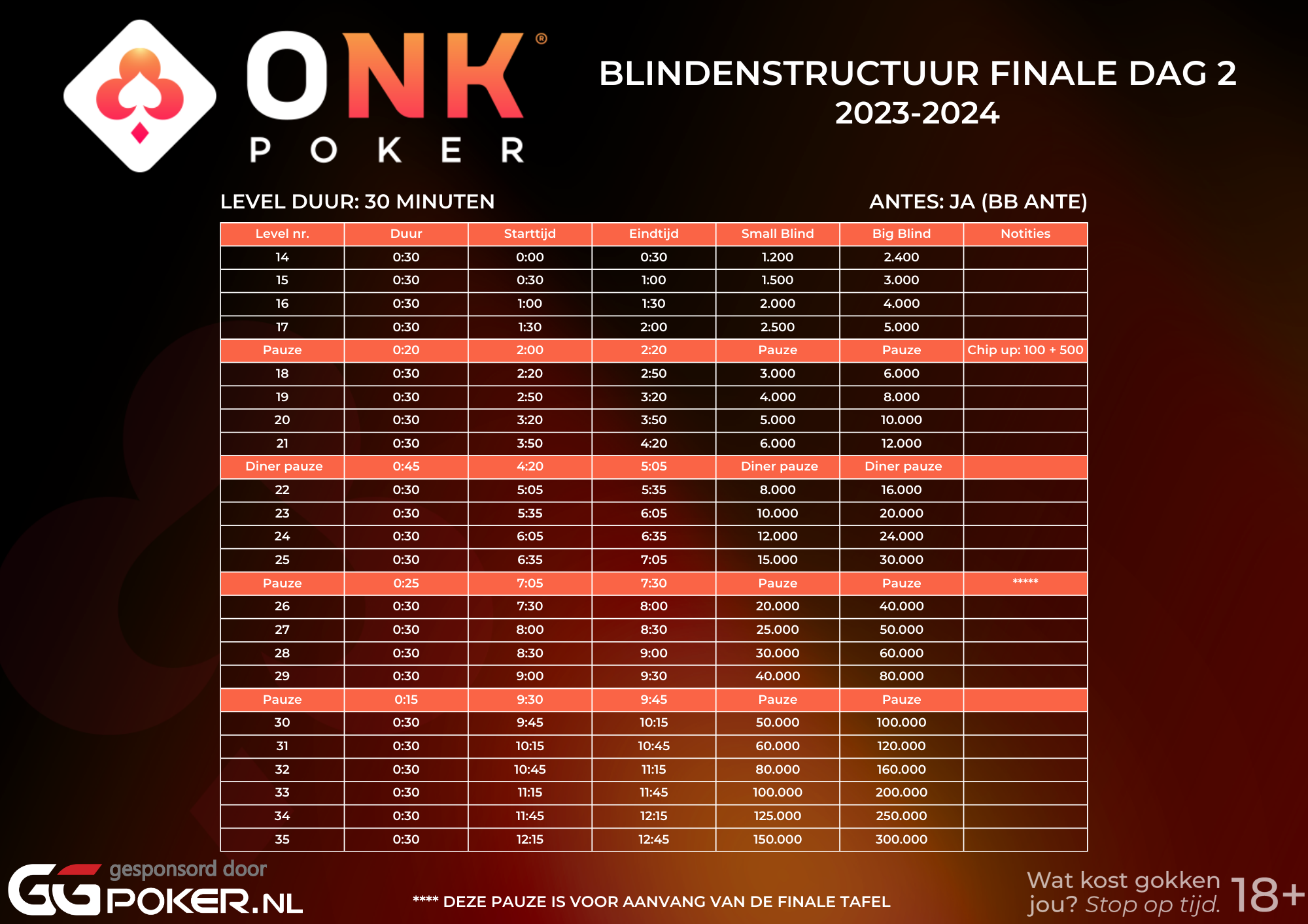 De finale van het ONK Poker vindt plaats op zaterdag 13 en zondag 14 juli in Hart van Holland te Nijkerk. Alle gekwalificeerde spelers kunnen zich inschrijven voor Dag 1A of Dag 1B die op zaterdag 13 juli gespeeld worden. De inschrijving sluit woensdag om 23:59 uur. Iedereen die na het eind van Dag 1 nog steeds in het toernooi zit gaat door naar de volgende dag. Zondag 14 juli wordt de finale hervat en zal er een nieuwe Pokerkampioen van Nederland gekroond worden!