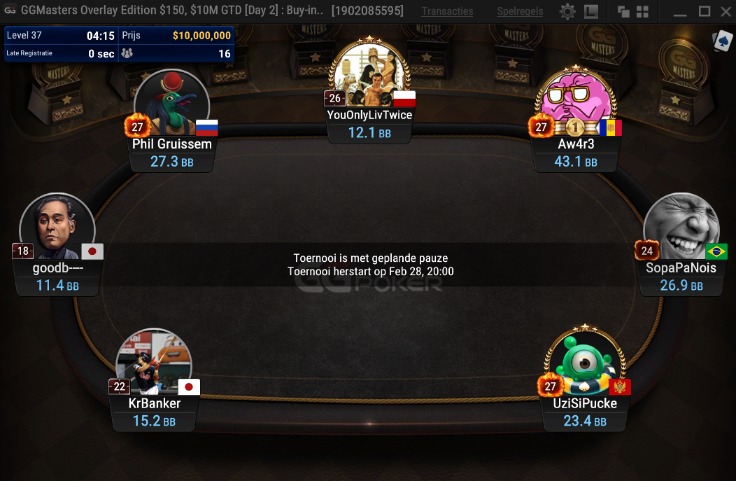 Gisteren om 20:00 ging dag 2 van de GGMasters Overlay Edition van start. Dag 2 ging van start met 6.383 spelers die zich allemaal via één van de 9 startdagen wisten te plaatsen. Het totale spelersaantal van de GGMasters Overlay Edition komt na de 9 startdagen in totaal op gigantisch aantal van 64.622 spelers. Na dag 2 zijn er nog spelers 15 spelers over die kans maken op de GGMasters titel en een waanzinnige 1e prijs van $806.385 dollar.