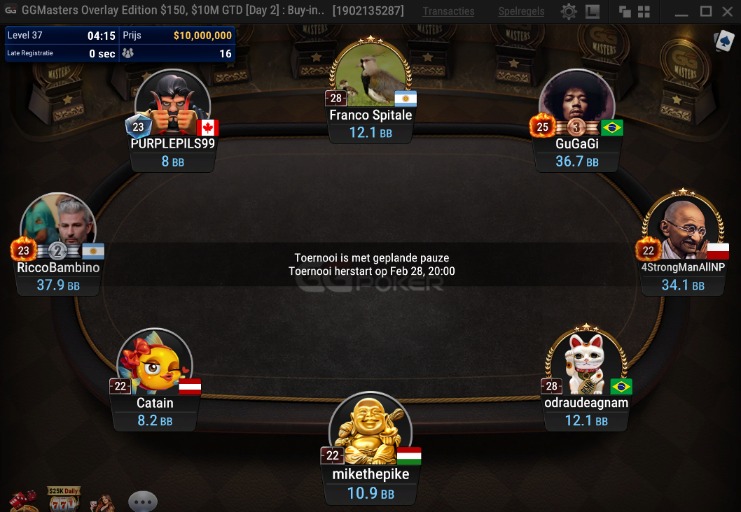 Na het spelen van 37 levels en iets meer dan 9 uur pokeren kwam er uiteindelijk een einde aan dag 2. Na een lange strijd zijn er nog 15 spelers over die allemaal zicht hebben de titel. Om 20:00 vanavond beginnen zij aan dag 3, met de blind levels op 1.00.000/2.000.000 en een 250.000 ante. ‘’Aw4r3'' uit Andorra heeft op dit moment de beste papieren om de GGMasters Overlay Edition op zijn naam te schrijven. Met een stack van 86.257.121 chips (43 BB) bezet hij momenteel de 1e plek. De Canadees ‘’PURPLEPILS99'' heeft nog werk aan de winkel en staat momenteel op de 15e plek met een stack van 15.919.353 chips (8 BB).