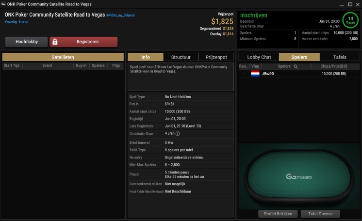 Om mee te kunnen doen aan het community toernooi moet je een account hebben op GGPoker. Wanneer je een account hebt op GGPoker kan je in de lobby zoeken naar ‘’ONK Poker Community Satellite Road to Vegas''. Wanneer je het toernooi aanklikt kan je je registreren. Om mee te kunnen doen is een wachtwoord nodig. Het wachtwoord om mee te kunnen doen is: onkpokervegas