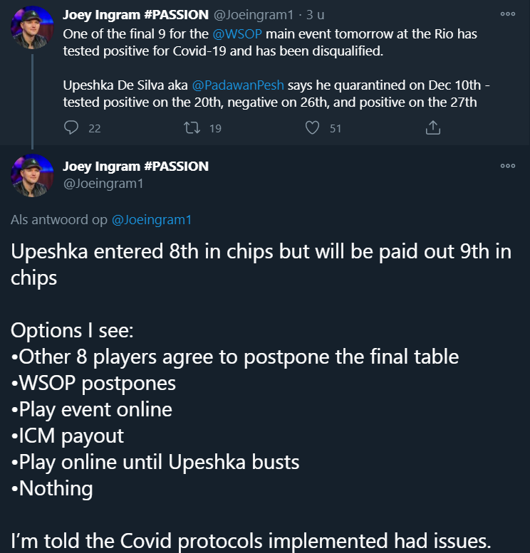 Er is ontzettend veel commotie op twitter over wat er nu moet gebeuren. Upeshka De Silva zegt namelijk dat hij op 10 december in quarantaine is gegaan, positief is getest op 20 december, negatief is getest op 26 december, en opnieuw positief is getest op de 27e. De Silva stond 8ste in chips, maar zal waarschijnlijk automatisch uitgeschakeld worden op de 9e plaats en daarmee het minimale bedrag als finalist ontvangen. Een hoop spelers vinden dit onzin aangezien er meerdere opties zijn om dit probleem "eerlijk" op te lossen. Hoewel er ook een grote partij is die wel vindt dat dit de juiste regeling is, aangezien de organisatie van de WSOP dit duidelijk heeft aangegeven voor het begin van het toernooi. Bij de andere WSOP finaletafel die in het Kings Casino werd uitgespeeld is er een soortgelijke gebeurtenis opgetreden. De Chinese speler Peiyuan Sun heeft besloten dat hij niet wilde reizen door COVID-19. Deze speler is daarom ook automatisch uitgeschakeld op de 9e plaats.