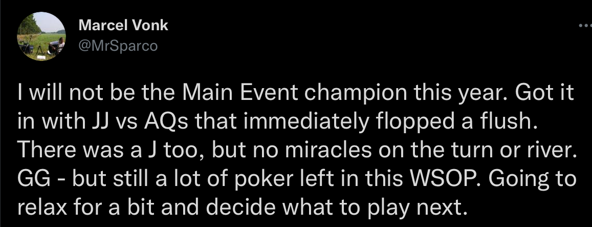 Dag twee begint goed als hij een leuke pot wint met TT en zijn stack uitbouwt naar 62.000 chips. Hierna speelt hij AK. De flop is AKJ met twee schoppen, de turn is een harten 5 maar de river is een schoppen 10 waardoor hij moet folden. Zijn stack krimpt hierdoor in naar slechts 22.000 chips. Hij haalt nog level 7 en gaat dan met nog een stack van 16.200 chips all inn met JJ. Helaas wordt hij gecalled door AQ suited die meteen een flush flopt. Einde Main Event voor Marcel. Maar niet einde van de WSOP er zijn nog een aantal toernooien die hij kan gaan spelen. Wij wensen hem veel geluk.